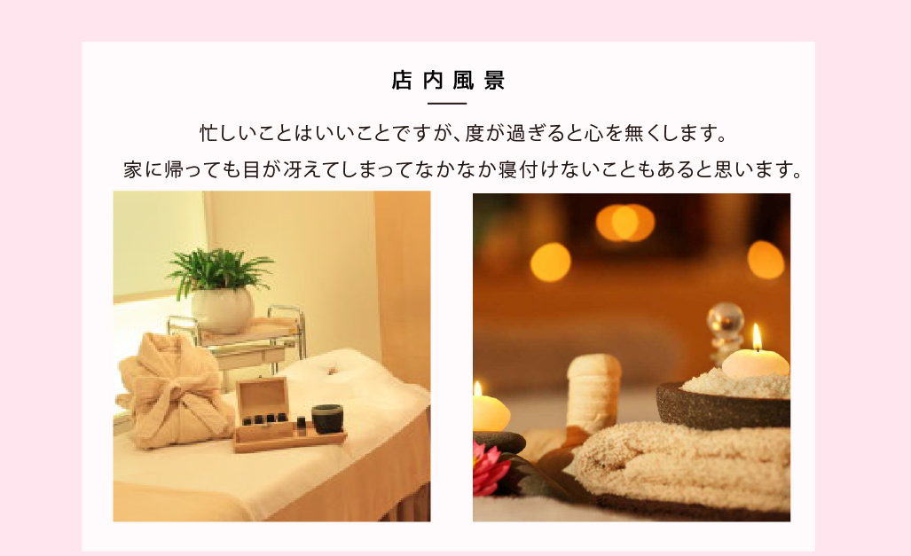 治癒力の働きを促進させます。オイルマッサ一ジをいたしま す、肌の毛穴が開き、オイルが良くしみこみます。これによ り、肌の乾燥を防ぎ、さらに老廃物の除去・血行促進の効果が あります、身体を暖めながら足のマッサ一ジをいたします、血 行促進と新陳代謝を向上させます。 。